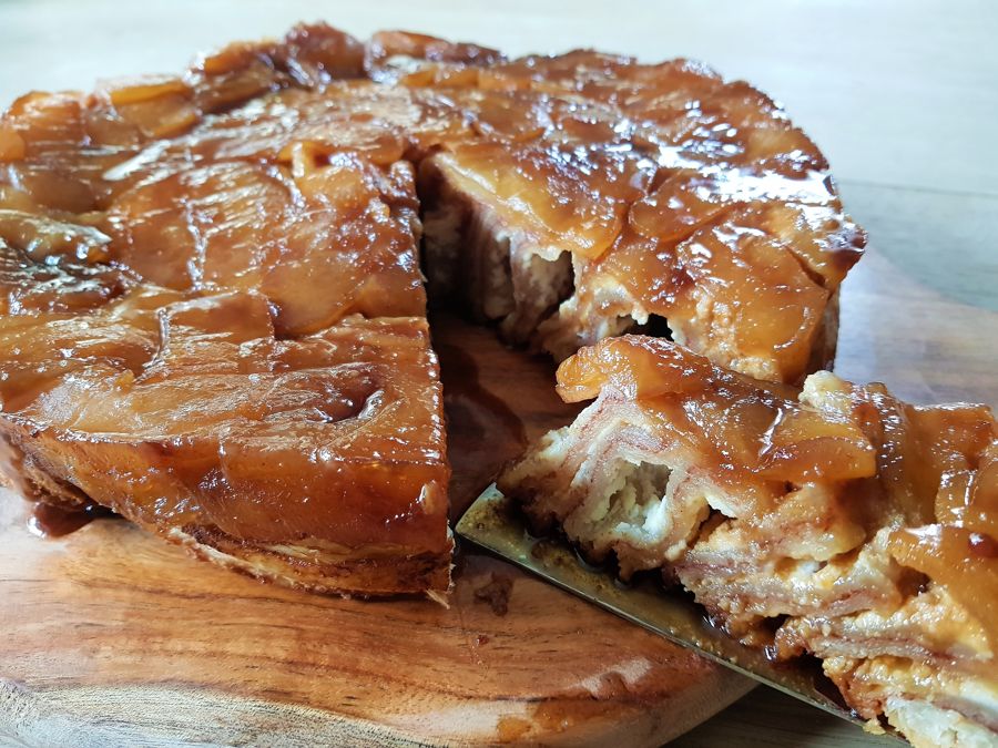 Niets lekkerder dan zelfgebakken appeltaart, vinden ze hier thuis. Nou, dat komt goed uit. Het is herfst en er zijn overal weer heerlijk frisse nieuwe oogst appels te koop. Daarom maken we deze week in Taart bij de Thee een speciale variant, namelijk een omgekeerde cinnamon roll appeltaart. Eigenlijk is het een kruising tussen een mega kaneelbroodje en een Tarte Tatin. Echt heel lekker!
