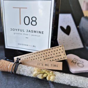 Wat er allemaal in zit? Om te beginnen 2 zakjes heerlijke Thee van ‘t HUIS namelijk T13 DOUBLE MINT FOR ME en T19 WHEN LIFE GIVES YOU LEMONS, 2 verrukkelijke repen chocola van Simply Chocolate, want chocola helpt altijd, een unieke beterschapskaart met een pakkende én passende tekst, een mooi zeepkoord en een klein zakje bloemzaadjes in de vorm van bloemetjes confetti. Daar groeien de mooiste bloemen uit.